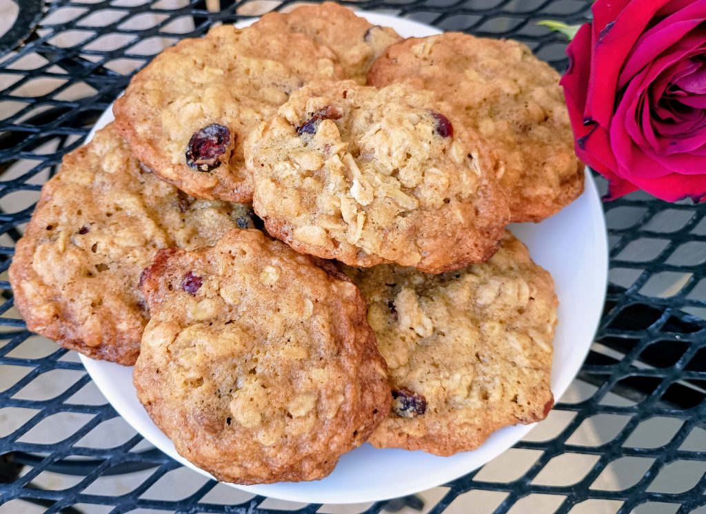 Oatmeal Cookies: Old fashioned Oatmeal, All purpose flour, Vanilla Extract, Chocolate Chips, Dried Cranberries, Brown sugar, Egg, (Eggless cookies upon special order) and unsalted Butter.